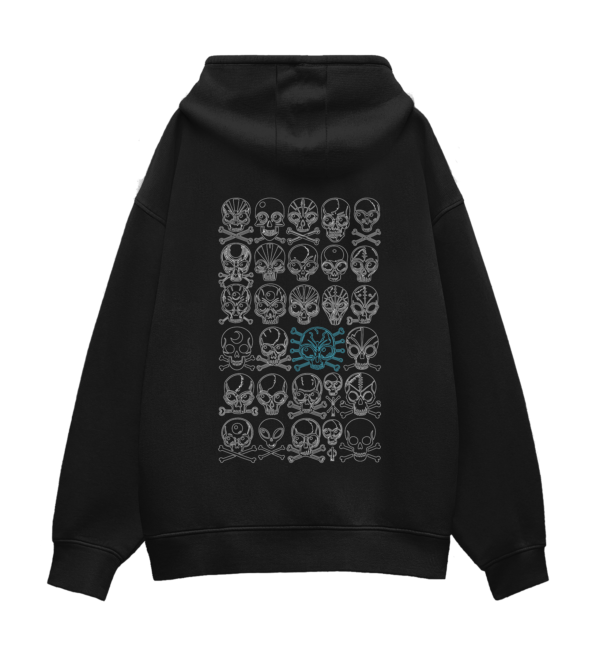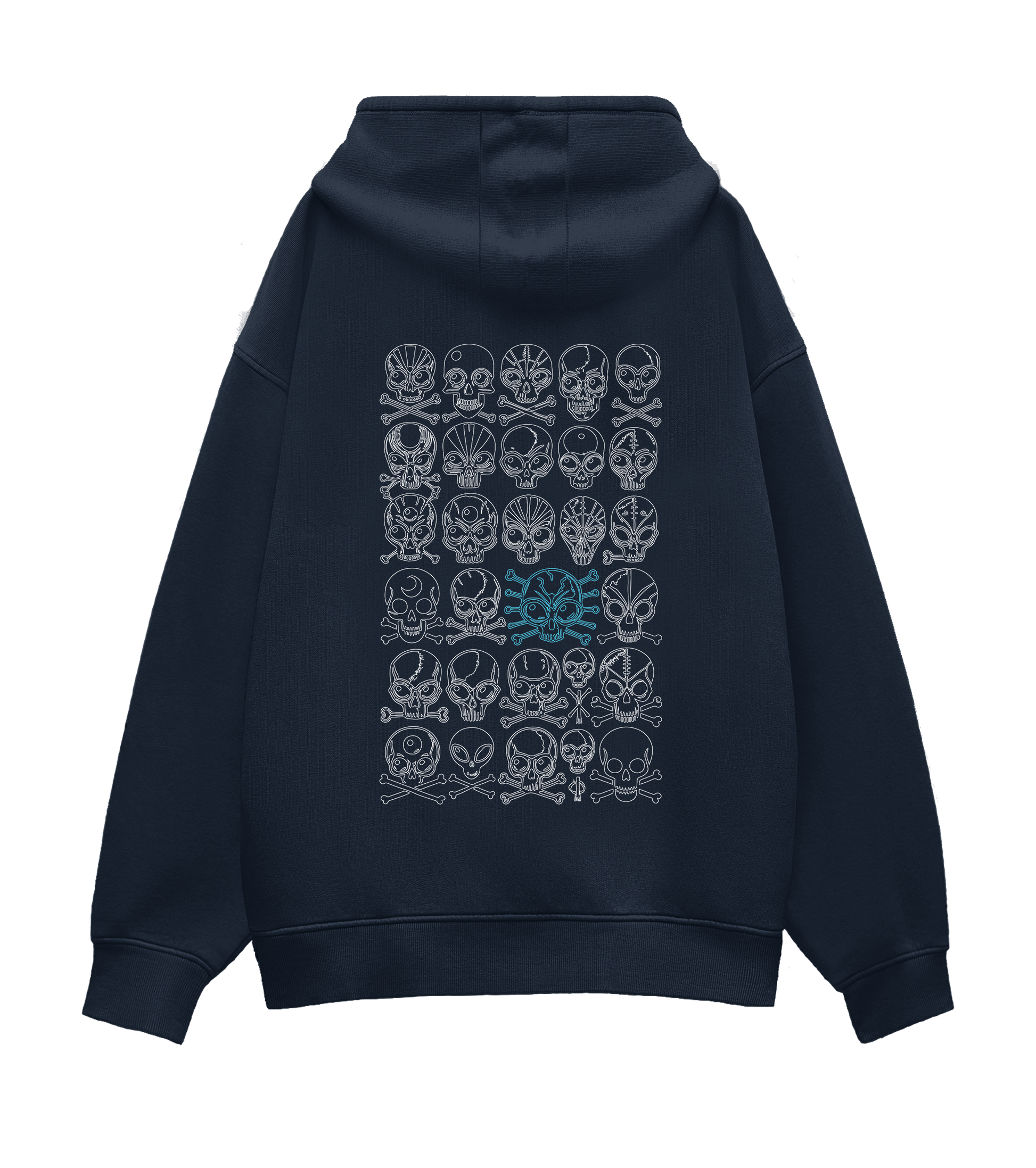Designed with a relaxed drop-shoulder fit, derby ribbed hem and cuffs, and a clean iconic front pared with a back showcasing an intricate grid of alien skulls—otherworldly, deliberate, unmistakable. It delivers quiet mystery with elevated comfort. Finished in Midnight Blue and Charcoal Black—made to stand apart, effortlessly.